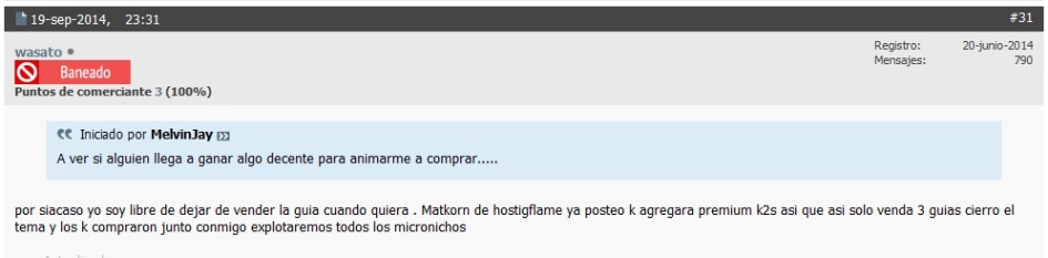 ****el viernes 26 entregare la guia y espero que todo aquel que hablo mal de mi se retracte y la historia de promoney o maxiweb la conoci dias antes de abrir mi tema y me asesore bien es mas hasta me burle porque le pusieron que tenia los huevos de hierro que era un caradura , si tan solo me hubieran mandado un mp diciendome wasato edita tu tema o para la pre venta y vendela cuandoe ste lista era suficiente para mi pero no me lo cerraron y me infraccionaron eso me dolio .