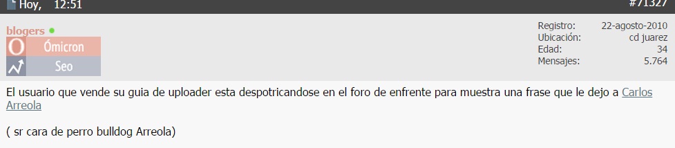***Mira no te insulto porque ya se por donde viene la mano de tu ataque y el de varios pero no caere en el juego , menos mal alla en su propio foro los usuarios me defienden incluso el sr cara de perro bulldog Arreola puso a un user " OYE TU PORQUE LE CALIFICASTE POSITIVO " y el usuario le respondio porque lo hizo y asi como el hay varios que los tengo x skype y que estan conmigo y me dicen que muchos alla no me quieren porque les da envidia que yo en 3 meses tenga mas confianza y le caiga mejor a la mayoria que algunos que llevan años alla y si mi guia tenia exito iba a acaparar toda la zona de negocios porque luego sacare mi guia de adsense y youtube y a otros les da envidia que alguien gane mas que ellos